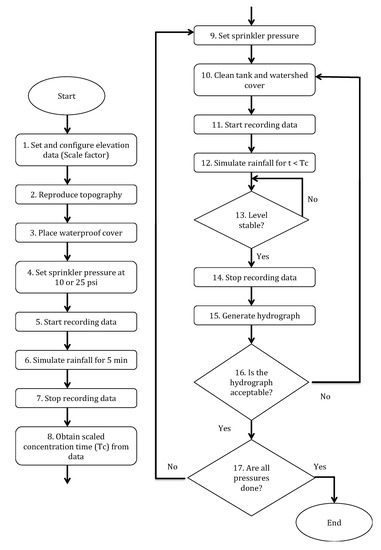 Once was known, rainfall was simulated over a time lower than this to obtain a bell-shape hydrograph; this was before the watershed became saturated. The data were recorded until the water level was stable again; this means that, even after the rainfall had stopped, the data were still being stored. To validate the test, the water level data were then converted to flow and plotted against time to obtain a hydrograph as the one shown in Figure 12 (Steps 9–16).