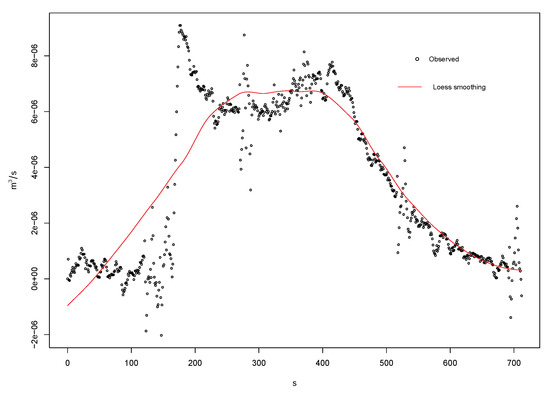The first part (Steps 1–2) is related to the topography reproduction of the watershed for which a scale factor related to the z axis must be configured to convert the elevation data from meters to the model scale in centimeters. Once the watershed is modeled, rainfall is simulated according to the previous experiments during a relatively long time (5 min was sufficient to saturate the watersheds in all cases) to obtain first the time of concentration () (Steps 3–8). Plotting the measured flow at this stage results in a flat bell shape as shown in Figure 11 where is observed at the moment when the flow starts to be relatively stable—the equilibrium discharge—in this case at 280 s. A Loess smoothing was applied in R language to reduce the noise and obtain a better estimation of the experimental time of concentration.