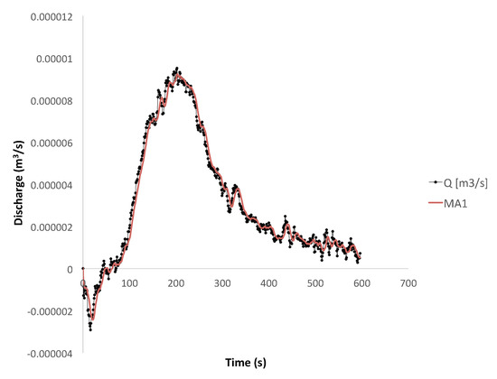 Chicomuselo hydrograph for 25 psi with a rainfall duration of 180 s. MA1 represents the Moving Average for every 10 data points