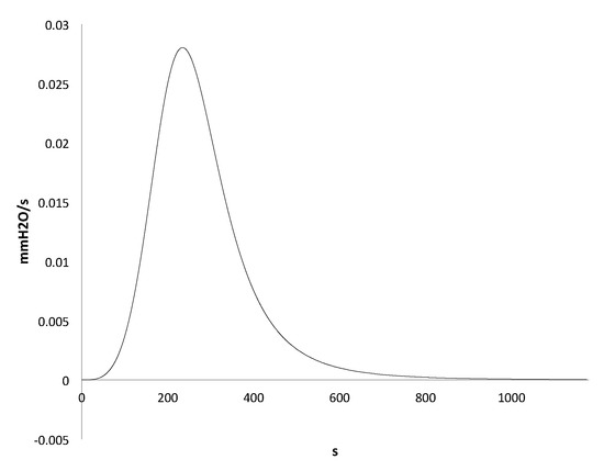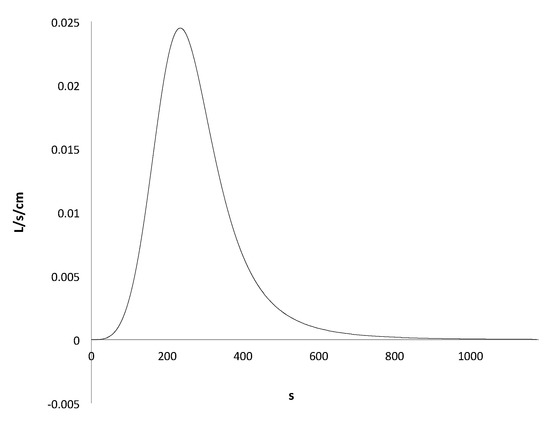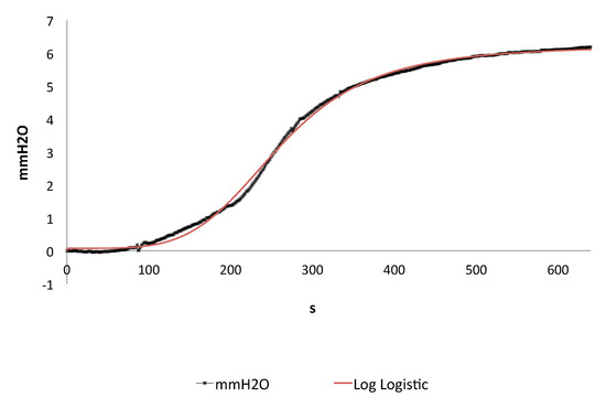 The hydrograph and its parameters (qp, tp, tb, and V) were then obtained from the derivative of the log logistic function, through Equation (9), which resulted in runoff data or the volume of water over time. In this case, a represents time in seconds, b mmH2O, and mmH2O per second, which can be converted to m3/s by multiplying mmH2O in meters by the caption tank area, which is 0.1726 m2, including the sensor container area used to reduce noise (liters were used to present the data in Table 2 for better visualization since the quantities of water during the simulation were very low).