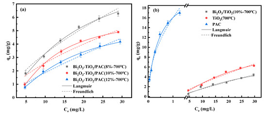 Adsorption isotherm of sulfamerazine (SMZ) adsorption on Bi2O3–TiO2/PAC with different molar ratios (a), Bi2O3–TiO2(10%–700 °C), TiO2(700 °C) and PAC (b).