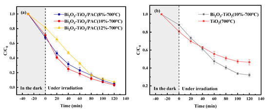 SMZ removal was enhanced initially by increasing the Bi/Ti molar ratio and decreased thereafter, while the Bi/Ti proportion reached a high level. Bi2O3–TiO2/PAC(10%–700 °C) exhibited the best removal efficiency from the beginning of solar light irradiation within 120 min, as shown in Figure 4a. When the Bi/Ti molar ratio was lower than the optimal amount, the Bi-O polyhedral was increased with an increase in the Bi/Ti molar ratio. It can prolong the life of carriers and increase the numbers of active sites and substrates adsorbed due to the smaller crystal size. However, when the Bi/Ti molar ratio was higher than its optimum amount, higher concentration of Bi increased the particle agglomeration of Bi2O3, which caused severe nanocrystal heterojunction decline and then affected the adsorption–photocatalysis performance [42].