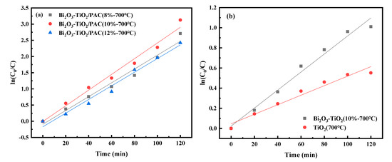 It can be observed in Figure 3 that the photocatalytic process for SMZ conforms to the pseudo-first-order kinetic model. The maximum kinetic constant of Bi2O3–TiO2/PAC(10%–700 °C) was 0.0242 min−1, which was 1.14, 1.15, 2.70 and 5.12 times higher than that of Bi2O3–TiO2/PAC(8%–700 °C), Bi2O3–TiO2/PAC(12%–700 °C), Bi2O3–TiO2(10%–700 °C) and TiO2(700 °C), respectively. The addition of PAC provided a photocatalytic reaction with a continuous higher concentration of SMZ than Bi2O3–TiO2; therefore, the photocatalysis could degrade SMZ more promptly. Additionally, the photocatalytic kinetic constant of Bi2O3–TiO2/PAC(10%–700 °C) was 1.84 and 1.27 times higher than that of Bi2O3–TiO2/PAC(10%–500 °C) and Bi2O3–TiO2/PAC(10%–600 °C), respectively (Figure S4).