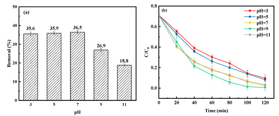SMZ adsorption on Bi2O3–TiO2/PAC(10%–700 °C) was significantly affected by the pH of the solution, which governed the dissociation degree of the functional groups on the composite and changed the surface potential of the material. It was shown that at pH 7.0 of the solution, SMZ was more easily adsorbed on Bi2O3–TiO2/PAC(10%–700 °C) (Figure 5a). Because of two acid–base dissociation points of SMZ, there are three forms of SMZ at different pH values [46]. The neutral molecular form is more readily adsorbed than the other forms [47]. When the pH of the solution was 3.0–7.0, the adsorption removal of SMZ gradually increased, which was due to H+ and SMZ competitive adsorption. With the continuous augmentation of pH, the adsorption removal of SMZ declined. The electrostatic repulsion between the anionic forms of SMZ and the Bi2O3–TiO2/PAC(10%–700 °C), as well as the hydrophobic effect on the surface groups of the composite, affected the adsorption performance of the SMZ.