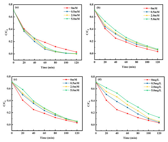 In the presence of Cl− and SO42−, as shown in Figure 6b,c, the removal efficiency for SMZ of Bi2O3–TiO2/PAC(10%–700 °C) slightly decreased with the different concentrations of Cl− and SO42−. Both these anions can react with h+ and ●OH (Equations (7) and (8)), resulting in a decrease in photocatalytic performance. It should be stated that Cl− was less influential than SO42− for photocatalysis. The 5.0 mM addition of SO42− led to a 17.8% decrease in photocatalytic efficiency compared to 0 mM SO42− in the solution at the initial 20 min. A previous study has reported that SO42− could be attached to the surface of TiO2 via van der Waals forces and hydrogen bonds, and replace some of the ●OH of TiO2 by a ligand exchange mechanism [50].