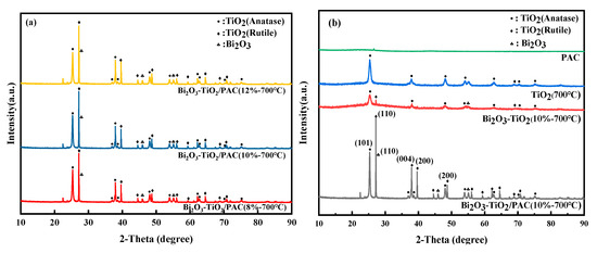 The sharp peaks with high intensity identified that Bi2O3–TiO2/PAC was well crystallized, which showed anatase (JCPDS 21-1272) and rutile (JCPDS 76-0323, JCPDS 88-1173) crystalline phases for TiO2 [51], and a Bi2O3 (JCPDS 74-1633, JCPDS 74-1373) crystalline phase [52] existed, as shown in Figure 7a. The percentages of rutile in the anatase–rutile mixtures for Bi2O3–TiO2/PAC(8%–700 °C), Bi2O3–TiO2/PAC(10%–700 °C) and Bi2O3–TiO2/PAC(12%–700 °C) were ca. 28, 31 and 34 wt%, respectively, which were determined using Spurr and Myer’s equation [53]. It has been shown that a mixture of these two crystals exhibited higher activity than pure anatase or rutile [54], especially the TiO2 crystal type composed of 30% rutile and 70% anatase, exhibiting the highest activity [55]. The average crystal size was calculated using the Scherrer equation [56], and the effect of the instrument broadening effect was deducted. As shown in Table 2, the average crystal size of Bi2O3–TiO2/PAC(10%–700 °C) was larger than that of Bi2O3–TiO2/PAC(8%–700 °C) and Bi2O3–TiO2/PAC(12%–700 °C); meanwhile, it was 2.1 and 1.9 times larger than that of Bi2O3–TiO2(10%–700 °C) and TiO2(700 °C). Due to doping Bi2O3 to TiO2, the intensity of the anatase phase in TiO2 decreased (Figure 7b), which promoted a rutile phase shift. The addition of PAC obviously enhanced the formation of the crystalline phase.
