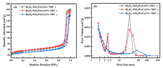N2 absorption–desorption isotherm analysis (a) and pore size distribution (b) of Bi2O3–TiO2/PAC with different Bi/Ti molar ratios.