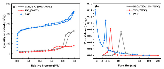 N2 absorption–desorption isotherm analysis (a), and pore size distribution (b) of PAC, TiO2(700 °C) and Bi2O3–TiO2(10%–700 °C).