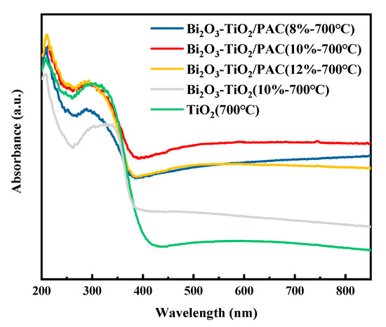 The absorption spectrum of Bi2O3-TiO2/PAC exhibited significant red-shifts to the visible−light region compared with Bi2O3-TiO2(10%–700 °C) and TiO2(700 °C), indicating the combination of Bi2O3-TiO2/PAC extended light absorption to visible light region and improved the light harvesting. The photophysical properties of Bi2O3–TiO2/PAC(10%–700 °C) revealed a stronger photo-absorption band in both ultraviolet and visible light than the others (Figure 10). The band gap of Bi2O3–TiO2/PAC(10%–700 °C) was 2.58 eV as calculated by the Tauc-plot method [57], which was the minimum among all. The formation of the heterostructure caused by the Bi doping and PAC loading reduced the band gap energy of Bi2O3–TiO2/PAC(10%–700 °C) [58]. It has been proposed that the energy band lies between the Ti4+ 3d band and Bi3+ 6s band [59].