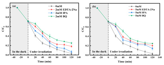 2 mM (a) and 5 mM (b) of scavenging agents concentration for ROS detection for SMZ removal by Bi2O3–TiO2/PAC(10%–700 °C).