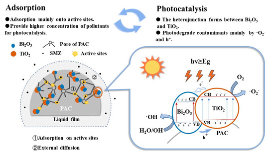 The coupling adsorption–photocatalysis mechanism of Bi2O3–TiO2/PAC in removing SMZ under solar light irradiation is illustrated in Figure 13. For the Bi2O3–TiO2/PAC system, SMZ was mainly adsorbed on the active sites of the Bi2O3–TiO2/PAC. Meanwhile, the ROS produced by the composite were non-selective and attacked functional groups of SMZ. A heterogeneous junction was formed by doping Bi2O3 with TiO2, which greatly reduced the band gap of the photocatalysts and provided good conditions for the separation of photo-generated carriers, greatly improving the photocatalytic performance under visible light. The adsorption capacity of PAC ensured persistent high levels of pollutants for the photocatalytic system [5]. Additionally, the combination of PAC could improve the adsorption performance and recovery rate of photocatalysts, which was of great theoretical and engineering significance for an appropriate adsorption–photocatalysis composite.