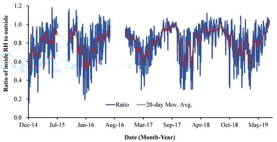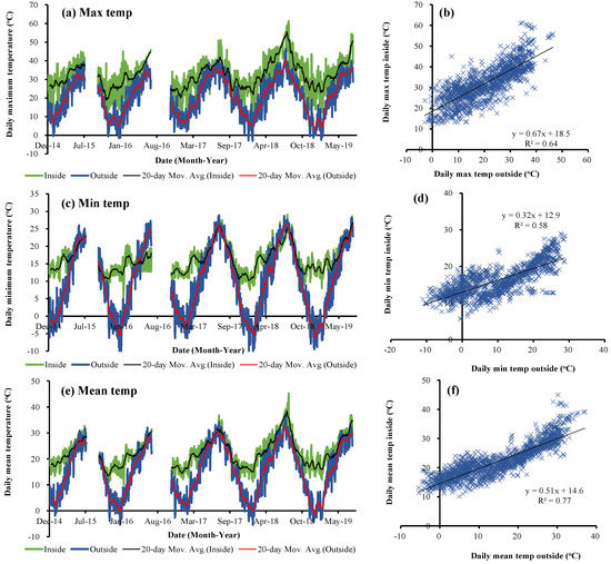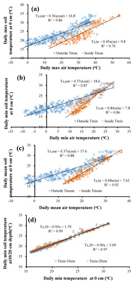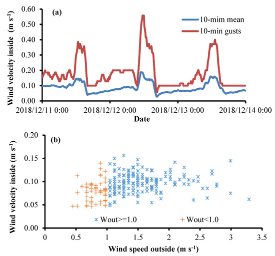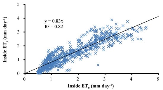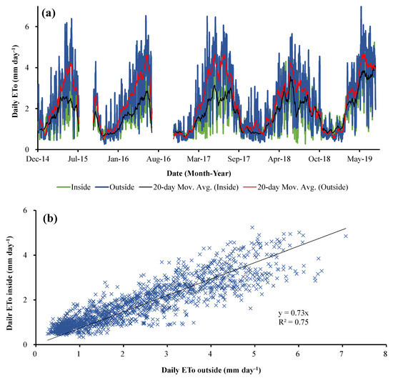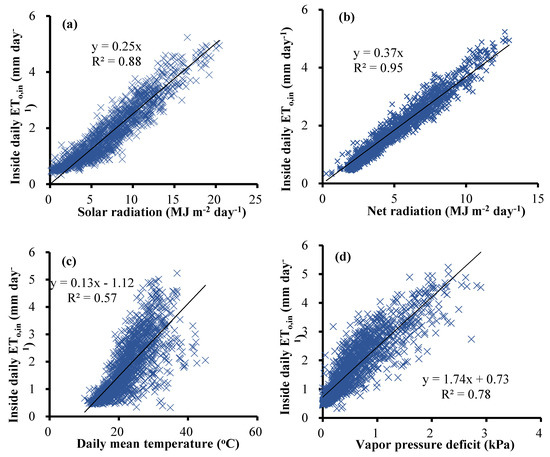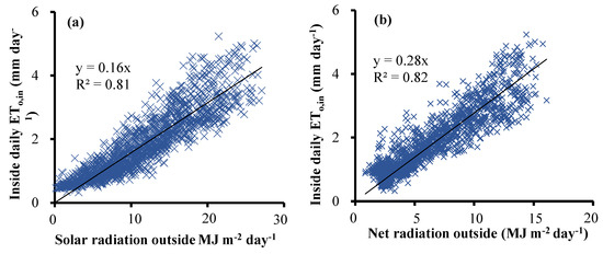 - ETo,in inside, was linearly related to that outside with a slope of 0.73. The approximately 27% lower inside than outside ETo,out was due to the wind speed reduction (−23.0%), relative humidity increase (−15.6%), radiation reduction (−8.8%), and air temperature increase (19.5%).