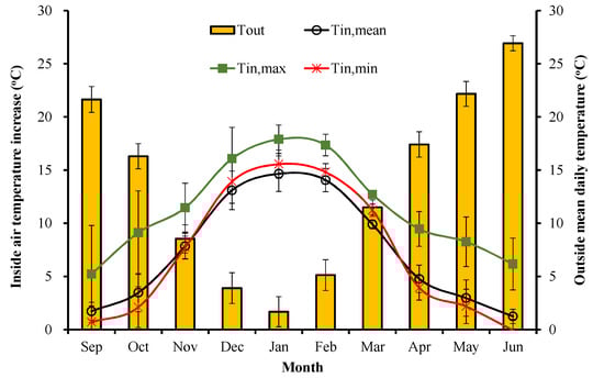 - The sunken solar greenhouse significantly improved microclimate conditions in the winter period by increasing the daily minimum air temperature to more than 10 °C, even when the outside air temperature was lower than −10 °C. This change can efficiently reduce low-temperature injures and enhance crop growth. Days with inside temperatures higher than 20 °C accounted for 78–90% of the total winter period, which significantly improved the microclimate condition and enhanced cucumber growth and yield.