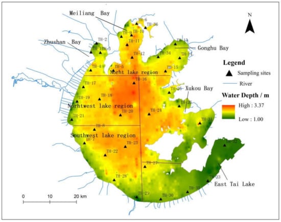 In the current study, Lake Taihu was divided into five regions, namely, north, northwest, southwest, northeast, and south lake regions (Figure 1). Zhushan Bay, Meiliang Bay, and Gonghu Bay with relatively serious pollution comprised the north lake area. Manshan Lake and Xukou Bay were distributed in the northeast lake area. East Tai Lake was distributed in the southern lake area.