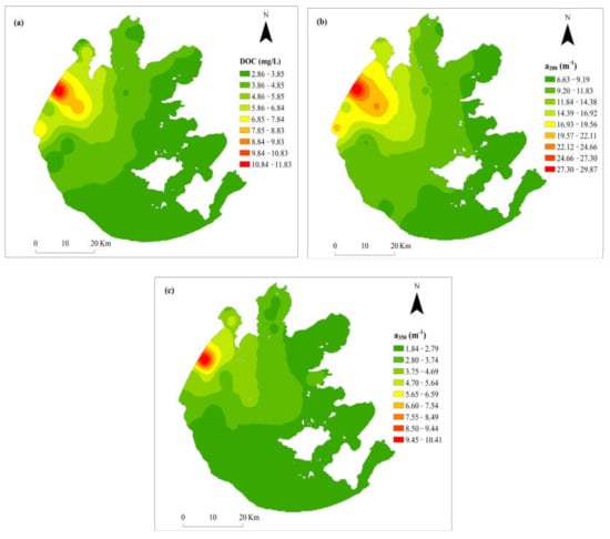 The concentration of DOM in the whole lake ranged from 2.86 to 11.83 mg/L (average, 4.38 ± 1.87 mg/L) and showed an increasing trend from southeast to northwest (Figure 2a). The average DOM concentration of each lake region revealed the order of northwestern lake region > northern lake region > southwestern lake region > northeastern lake region > southern lake region.