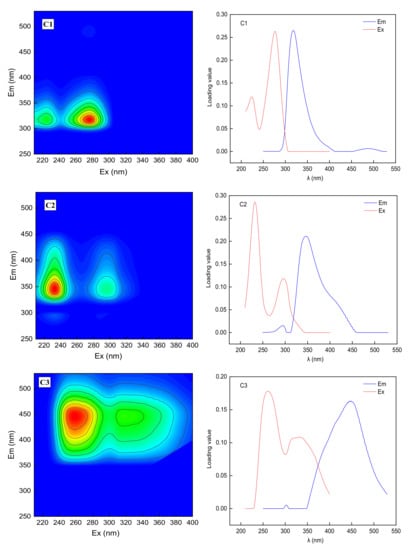 PARAFAC is an iterative type three-dimensional array decomposition algorithm based on the alternating least squares principle. On the basis of trilinear decomposition theory, PARAFAC decomposes a three-dimensional array X composed of EEM data into a three-load matrix and then unfolds the three-dimensional fluorescence spectrum of CDOM [40]. This algorithm can objectively identify the characteristics and concentrations of the fluorescence components in samples.