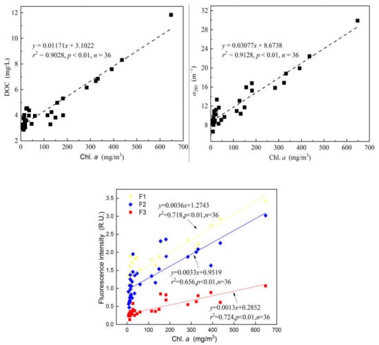 This study was conducted at the early stage of algal bloom in Lake Taihu. The mean content of chl. a reached 109.23 mg/m3 and exceeded 500 mg/m3 in the northwestern lake region, where a large amount of algae accumulated; indeed, this region is a typical area of severe eutrophication. To determine whether the DOM in the water of Lake Taihu at the early stage of algal bloom was related to algae, a correlation analysis and regression analysis were conducted between the relevant indicators of DOM and chl. a concentration (Figure 4).