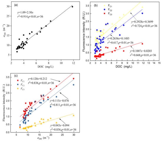 Correlation between a280, DOC, and the fluorescence intensities of FDOM components in the overlying water of Lake Taihu. (a) Correlation between DOC and a280; (b) Correlation between DOC and fluorescence intensities of FDOM components; (c) Correlation between a280 and fluorescence intensities of FDOM components.