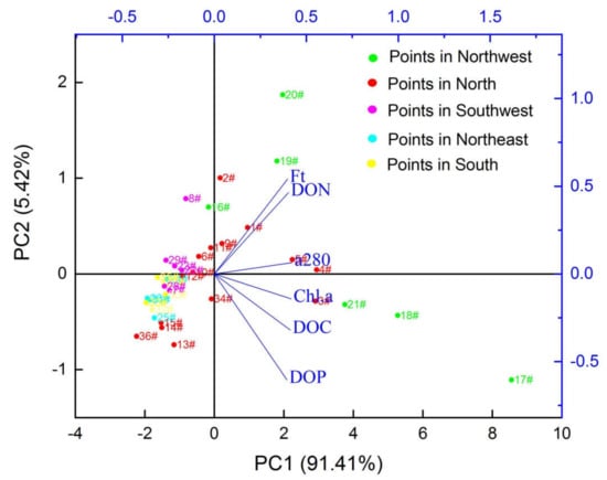 Plots of samples and variables from a principle components analysis of DOC, a280, Ft, chl. a, DON, and DOP in the overlying water of Lake Taihu.