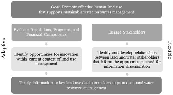 While a great deal of water resource information is available online, land use decision-makers often have limited time to research current and reliable water resource information to inform their actions. Therefore, more emphasis should be placed on enhancing deliberately planned coordination [], access to information [,], and creating opportunities for water professionals to engage with land use decision-makers []. By coordinating in focused, meaningful ways, decision-makers will have more of the needed water resources context to promote incentives, encourage innovation, and integrate programs.