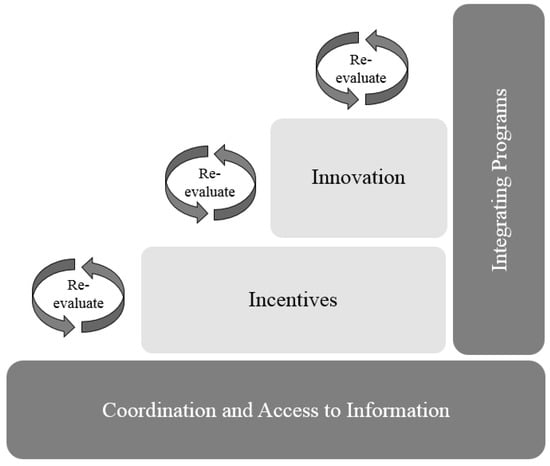 Based on an extensive literature review, this paper identifies four opportunities for innovation in the Potomac that enhance the current regulatory, programmatic, and financial approaches for integrating land and water management and address the existing challenges identified in this study. The four opportunities discussed here are (1) improving access to information, (2) promoting incentives to achieve desired outcomes, (3) developing a framework that encourages innovation, and (4) integrating programs to achieve multiple objectives. These four opportunities build on one another and are, at the same time, infused in one another (Figure 3). No single innovative approach is adequate under all circumstances, requiring the locale-specific adoption of appropriate strategies and inherent flexibility to adapt over time [,]. A rationale for incorporating each of these in the Potomac strategy is discussed in turn below. The discussions include land use planning case studies related to farmers markets, housing, green infrastructure, and placemaking.