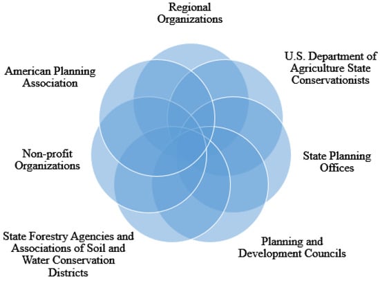 A stakeholder-driven comprehensive water resource planning process in the Potomac basin resulted in a renewed desire to promote integrated land and water decision-making []. The comprehensive plan was completed in 2018 and included participation from a range of geographically and substantively diverse organizations. The five major topic areas of the plan are ensuring sustainable water use and supplies, protecting and improving water quality, managing human land use for sustainability, protecting ecological health, and addressing challenges that cut across these topic areas (e.g., source water protection, climate change, and floods and droughts). The implementation of the land use component of the plan focuses on enhanced information sharing among land and water managers and stakeholders. The goal is to inform sound land use decision-making that supports sustainable water resource management [].