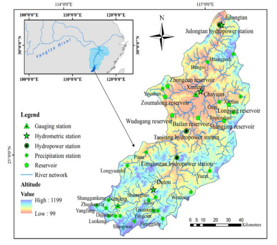 The Taojiang River drainage basin (Figure 1), covering an area of 8440.0 km2, is located in the upper reaches of the Ganjiang River Basin in the middle and lower reaches of the Yangtze River (geographical location: 24°28′–25°53′ N; 114°11′–115°19′ E) [23]. It mainly consists of low and medium mountains and hills, with the altitude gradually lowering from south to north. The mountains are located in the upstream area of the river and the east side of the basin, with the tallest peak reaching 1199 m. The terrain in the middle and lower reaches fluctuates mildly, with an average elevation of around 300 m. The watershed is mainly covered by red, yellow-red, and paddy soils, which account for more than 95.0% of the total soil area. The vegetations in the watershed are rich and diverse, but dominated by evergreen broad-leaved forests, evolving to deciduous broad-leaved mixed forests with the increase in altitude. The major land use type is forest (77.0%), followed by cultivated land (17.5%). Navel orange, citrus, and chestnut are featured crops. Located in the subtropical humid monsoon climate zone, the regional weather is warm and humid, with abundant sunshine and rich precipitation [24]. The annual average precipitation in this area is 1580.6 mm, which is unevenly distributed throughout the year. The precipitation from March to August (the flood season) accounts for 74.0% of the total annual precipitation. The inter-annual precipitation difference is relatively large. The precipitation in a flood year can be 2 times as much as that in a dry year. By the year 2005, nine water conservancy projects were completed on Taojiang River, including 3 hydro-power stations (Julongtan, Longtoutan, and Taojiang power stations) and 6 reservoirs (Longjing, Shangjing, Bailan, Wudugang, Zoumalong, and Zhongcun reservoirs).