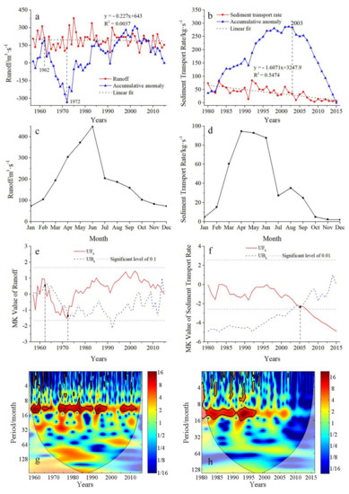 Figure 2 shows the average runoff volume (from 1957 to 2015, Figure 2a) and sediment transport rate (from 1980 to 2015, Figure 2b) on inter-annual scales, as well as the same categories on annual scales (Figure 2c,d, respectively), together with the M-K analyses (Figure 2e,f) and WTC analyses results (Figure 2g,h) at Julongtan station.