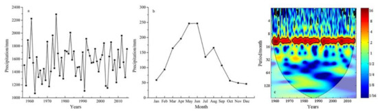The inter-annual (a) and annual (b) changes of precipitation and the continuous wavelet transform analysis (c).