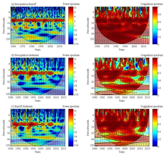 Figure 4a shows the results of cross-wavelet analyses applied to the monthly precipitation, runoff, and sediment transport volumes. In the cross-wavelet energy spectrum and coagulation spectrum of the precipitation and runoff volume, a significant resonance cycle with a magnitude of about 1 year was observed in the high-energy area, with one interruption occurring in 1971. During this period, the precipitation was positively correlated with the runoff volume and the correlation coefficient exceeded 0.9, proving that the precipitation was a dominant factor controlling the runoff volume. In the low-energy area, the significant resonance cycle area covered more than 90% of the entire wavelet coherence COI, which was consistent with previous studies [31,32,33].