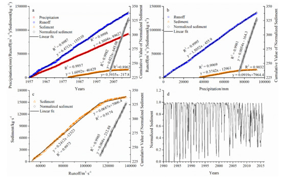 Accumulative curves (a) for 1957–2015 and double mass curves (b,c) for precipitation, runoff, and sediment transport in the study area, along with normalized sediment (d) for 1980–2015 over the measurement periods.