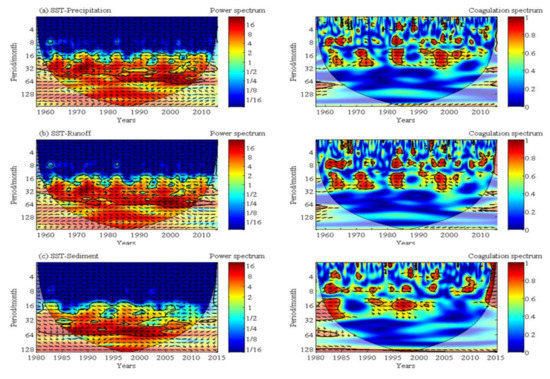 Cross-wavelet analysis between the SST and precipitation (a), runoff (b), and sediment transport (c) volume.