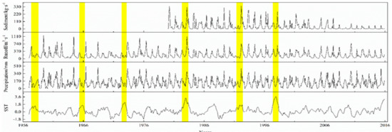 Further comparisons were made between the SST and precipitation, runoff, and sediment transport volume during major ENSO events (lasting for more than 10 months) from 1957 to 2015 (Figure 7). The durations of major ENSO events during this period were from April 1957 to July 1958, May 1965 to April 1966, May 1972 to March 1973, April 1982 to June 1983, May 1991 to June 1992, and May 1997 to May 1998. During each ENSO event, the SST first rose to a maximum and then declined, exhibiting a convex changing curve. The precipitation revealed a similar changing trend during each ENSO event—at the beginning of each ENSO event, it declined to the minimum and then increased; at later stages, it reached its maximum and then declined again. During each ENSO event, the changing trend for runoff and sediment transport volume was basically similar to that of precipitation. ENSO influences the rainfall related to precipitation, which affect the runoff and consequently affect sediment transport.
