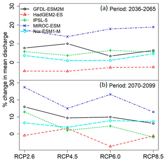 Percentage change in mean flow for the four Representative Concentration Pathways (RCPs) and five General Circulation Models (GCMs) for the two periods 2036–2065 (a) and 2070–2099 (b) are shown.