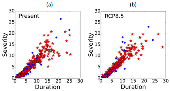 Bivariate interrelationships of duration–severity for return periods 2, 5, and 10 years for the mid (a) - and end (b)-century and four RCPs separated for GCMs.