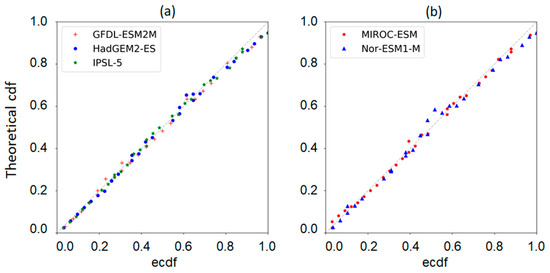Empirical against theoretical cumulative distribution function from fitted Frank copula. Results correspond to the historical period (1971–2000) and all five driving GCMs: (a) GFDL-ESM2M, HadGEM2-ES and IPSL-5; (b) MIROC-ESM and Nor-ESM1-M.