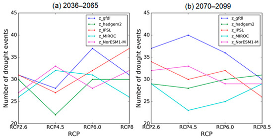 The number of drought events is observed to be clearly GCM and RCP dependent. For the first projection period, the number of events is expected to vary between and calculated over all GCMs and RCPs. Similar projections are observed in the 2070–2099 period for which the number of events varies within the range .