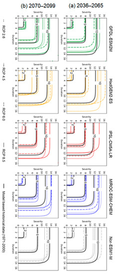 The differences in the projected bivariate patterns can be visualized comparing two models, namely, GFDL-ESM2M and MIROC-ESM-CHEM. Considering the same 2036–2065 projected period and same return period , model 1 (GFDL-ESM2M) shows severity values between 12 and 14 (over all RCPs) for the duration in the range months (Figure 5). The driving model 2 (MIROC-ESM-CHEM) shows, on the other hand, a clearly larger spread among RCPs with values varying from 11.5 to around 15 for the duration in the same range.