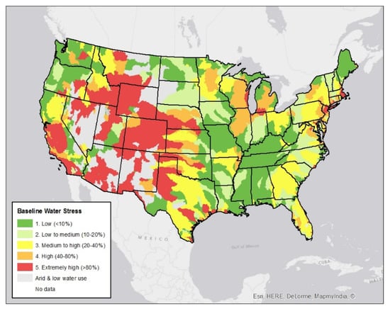Baseline Water Stress Map of the United States, Source: U.S. Geological Survey National Water Information System, https://waterdata.usgs.gov/nwis [].