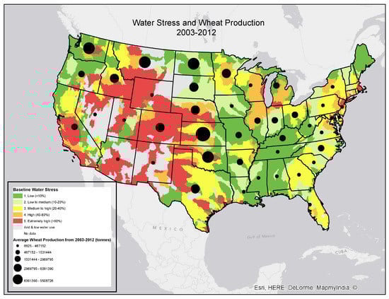 To indicate the level of water-stress in each region, we use a ratio of water use to water availability. To generate the water stress level, we create a ratio of water use (water consumption for agricultural use in cubic acre feet, see above) to water availability (ground and surface water available by cubic acre feet, see above), then transfer the ratio to Geographic Information System (GIS) and map it to represent the data as graduated levels of water stress by county from low to high. The primary data source for the statistical mapping of water stress is the U.S. Geological Survey National Water Information System and it is verified against, and constitutes no data inconsistency [,], and U.S. Drought Monitor [,]. We statistically mapped the graduated levels of water stress, and then overlaid them with the quantity of the water-intensive commodities produced in that region. The overlay is designed to create cognitive dissonance between seeing high levels of water stress in areas where the US grows large quantities of its main crops. These data show where the four major crops are grown in large quantities in water stressed regions. The size of the overlay circle, or “crop circle,” is determined by the quantity of the crop grown. The size of the overlay circle indicates if the amount of that crop grown is minimal, low, medium, high, maximum, and it is measured in tons, at the state level, averaged over five years to eliminate outliers such as localized short term droughts or flood events. The overlay of the water-stress map and the quantity of crop production exposes the regions in which most water-intensive crops are grown in the most water-scarce areas. A detailed description of how to replicate this study, including data collection and sources, definitions, measurements, calculation of water stress levels, determining the size of crop circles, superimposition of the overlay, and other elements of the analysis are included in the Appendix A.