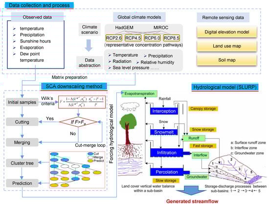 The framework of the ensemble climate–hydrology modeling system (the flowchart of semi-distributed land use-based runoff process (SLURP) is derived from Sun et al. [24]).
