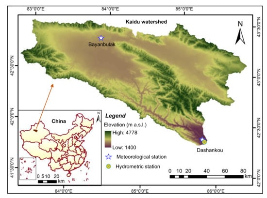 Kaidu watershed is a cold–arid region, located between 42°14′ N–43°21′ N and 82°58′ E–86°05′ E in northwest China (as shown in Figure 2). The watershed covers an area of 18,827 km2 with a large contrast in elevation (from 1400 to 4778 m a.s.l.). As recorded in the meteorological station of Bayanbulak (with an elevation of 2487 m a.s.l.), the annual temperature of this basin is −4.5 °C, and the minimum temperature is about −48.1 °C. It has an average annual pan evaporation of 1100 mm and precipitation of 262.6 mm [24]. Due to the variation in elevation, this basin is characterized with strong gradients in both temperature and precipitation. The annual temperature and precipitation in Dashankou Station (with an elevation of 1400 m a.s.l.) are 7.5 °C and 99.6 mm, respectively. Besides, precipitation also varies with seasons and more than 80% of the annual precipitation occurs from May to September. The gross annual amount of surface water resources of the basin is approximately 3.3 × 109 m3.