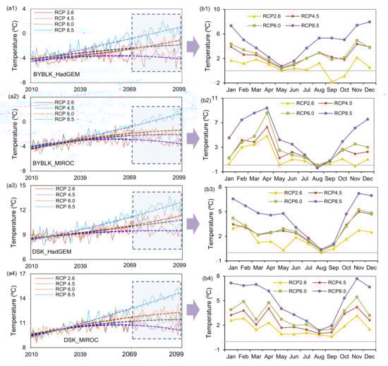 Temperature under different scenarios [(a1)–(a4) are the annual temperature during the period 2010–2099 and (b1)–(b4) are the monthly average changes in 2080s compared with baseline period].