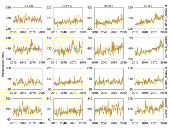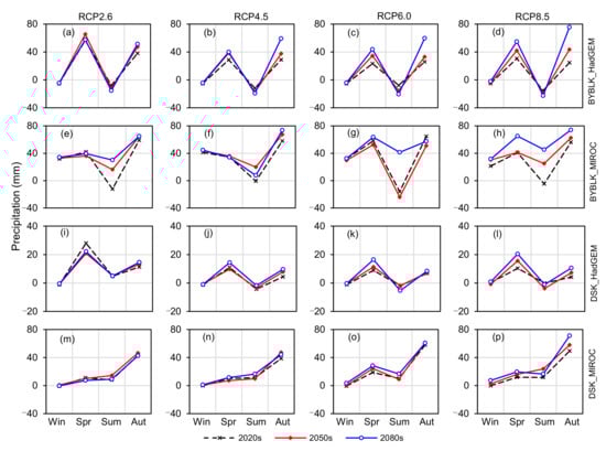 Figure 4 depicts the estimated annual precipitation in all scenarios. The results show that the precipitation shows an overall upward trend. By the end of the 21st century, the decadal precipitation in Bayanbulak increases by approximately 0.8–4.2 mm (RCP2.6), 3.4–5.6 mm (RCP4.5), 7.1–15.5 mm (RCP6.0) and 12.7–24.6 mm (RCP8.5); the precipitation in Dashankou increases by about 0.4–0.8 mm (RCP2.6), 2.2–2.8 mm (RCP4.5), 0.9–2.6 mm (RCP6.0) and 2.5–6.8 mm (RCP8.5). It shows that precipitation variation in Bayanbulak is greater than that in Dashankou. This is because Bayanbulak is located in a cold mountain area at high altitude, which is more sensitive to climate change. Besides, the projected precipitation under MIROC is higher than that under HadGEM. Annual precipitation in most years of the 21st century is about 150–300mm higher than the baseline under MIROC, and 50–150 mm higher than the baseline under HadGEM. This shows that different GCMs have a large amount of predicted precipitation due to the inconsistency of physical mechanisms and initial parameters. Besides, GCM’s ability to predict precipitation is still relatively poor, and there is a large deviation. The seasonal changes of precipitation summarized in Figure 5 show that precipitation in spring and autumn in both stations would increase. However, the summer and winter precipitations present decreasing trends. This means that in the Kaidu watershed, abundant precipitation in spring and autumn would result in a balanced distribution of rainfall within the year. The decreasing winter precipitation indicate that winter will become more arid, and the possibility of seasonal drought time will increase.