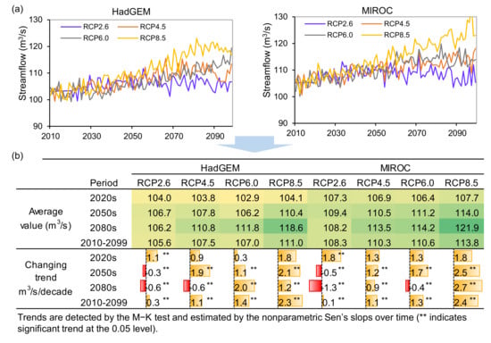 Projected annual streamflow [(a) time series of streamflow during the period 2010–2099 and (b) the associated average values and changing trends by Mann–Kendall test].
