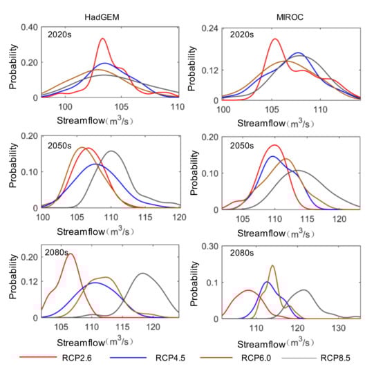 Figure 6 shows the predicted runoff of Kaidu watershed in 2010–2099. There are certain differences in the runoff across the eight scenarios. For example, under the HadGEM model, the average streamflow during the period 2010–2099 under the four RCP scenarios are 105.6 m3/s (RCP2.6), 107.4 m3/s (RCP4.5), 107.0 m3/s (RCP6.0) and 111.1 m3/s (RCP8.5), respectively. The average annual streamflow in the four RCP scenarios under the MIROC model are 108.3 m3/s (RCP2.6), 110.3 m3/s (RCP4.5), 110.6 m3/s (RCP6.0) and 113.8 m3/s (RCP8.5). In general, the streamflow in the RCP2.6 scenario is the least, and the streamflow in the MIROC model is higher than that in the HadGEM model, which is consistent with the changing trends of temperature and precipitation. By comparing various scenarios, the possible streamflow range of the Kaidu River in the future can be obtained, avoiding the errors caused by the prediction of a single scenario.