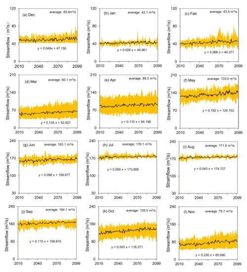 Monthly streamflow during the period 2010–2099 (the orange color is the range of streamflow, the black line is the average streamflow, and the white dotted line is the trending line).