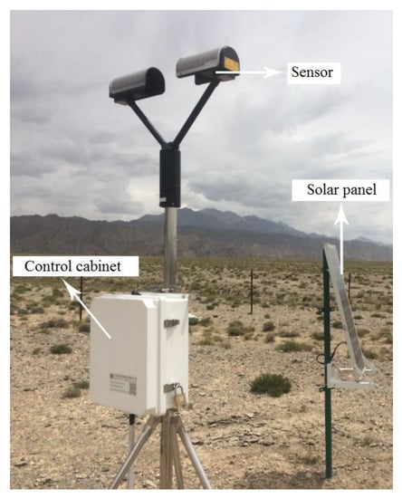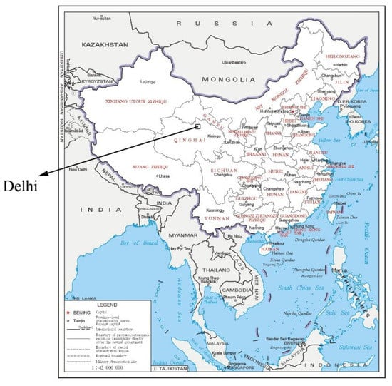 The study area, Delhi, is located in the inland region of the Qinghai–Tibet Plateau in western China, i.e., in the northeastern part of Qaidam Basin (see Figure 1). This region has a highland continental climate with year-round drought and little rain. The annual average temperature is about 4.5 °C, and the average annual precipitation is about 200 mm. The mean elevation of this region is over 2800 m. In addition, this region lies in the temperate zone, mainly dominated by a plateau monsoon climate []. Normally, most of the annual precipitation occurs in the wet season from May to October [,].