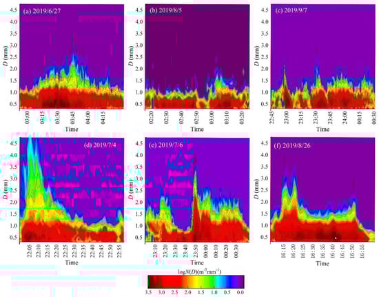 Changes of N(D) over time for precipitation processes of (a) 2019/6/27 3:00–4:43, (b) 2019/8/5 2:16–3:25, (c) 2019/9/7 22:44–2019/9/8 00:31, (d) 2019/7/4 22:02–23:00, (e) 2019/7/6 23:05–2019/7/7 00:48 and (f) 2019/8/26 16:11–17:04. Note: the color bar represents the raindrop concentration on the logarithmic scale (i.e., log10(N(D)).
