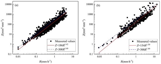 Based on the data from the above six precipitation events, the two coefficients of the Z–R relationship are quite different. However, for the same type of precipitation, certain regularities can still be summarized. Based on the data derived from stratiform and convective precipitation (Table A1), the results shown in Figure 6 could be obtained using the curve fitting tool in MATLAB. The coefficients of determination were 0.55 and 0.43 for stratiform precipitation and convective precipitation, and the fitting passed the significance test of 0.05. That indicates that the fitting performance for stratiform precipitation is better than that for convective precipitation. For stratiform precipitations, the values of a (i.e., 186) are lower than for the standard Z–R relationship (i.e., a = 300), and the value of b (i.e., 1.42) is higher than for the standard Z–R relationship (i.e., b = 1.40); by contrast, for convective precipitation, the value of b (i.e., 1.50) is also higher than for the standard Z–R relationship, the value of a (i.e., 154) is lower than that for the standard Z–R relationship. That is attributed to the fact that the exponential factor b is only related to the shape factor μ of the raindrop size distribution and b increases with the increase of μ []; moreover, the shape factor of convective precipitation (i.e., μ = 6.28) is higher than the shape factor (i.e., μ = 5.82) of stratiform precipitation. In contrast, the coefficient a is related to the shape factor μ, total raindrop concentration NT, and mass weighted diameter Dm. The coefficient a increases as Dm increases, and decreases as NT increases []; moreover, the NT of convective precipitation (i.e., NT = 680.31 mm−3) is much larger than the NT of stratiform precipitation (i.e., NT = 288.04 mm−3), which results in the coefficient a of convective precipitation being smaller than a of stratiform precipitation. Known from Figure 6, the red line is below the blue line, which means that when R is the same, Z derived from the standard Z–R relationship is less than that value fitted. Therefore, the standard Z–R relationship will underestimate the radar reflectivity factor in this region.